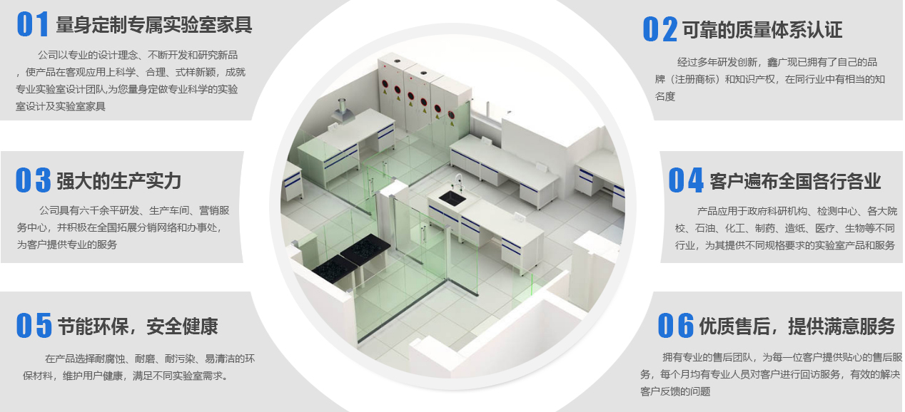 山東鑫廣實驗設(shè)備科技有限公司成立于2007年,是一家位于山東濰坊的實驗室家具工廠。作為實驗室整體解決方案服務(wù)商,我們提供從實驗室規(guī)劃、實驗室設(shè)計、實驗室裝修、實驗室工程、實驗室家具、實驗室設(shè)備、到實驗室服務(wù)等實驗室建造一站式服務(wù),致力于專業(yè)研發(fā)、設(shè)計、生產(chǎn)實驗室家具等產(chǎn)品及相關(guān)配套設(shè)備,并提供實驗室建設(shè)全套解決方案的新型高科技企業(yè)。公司下設(shè)研發(fā)加工工廠、營銷服務(wù)中心,并積極在全國拓展分銷網(wǎng)絡(luò)和辦事處,為客戶提供更專業(yè)、優(yōu)良的產(chǎn)品和服務(wù)。